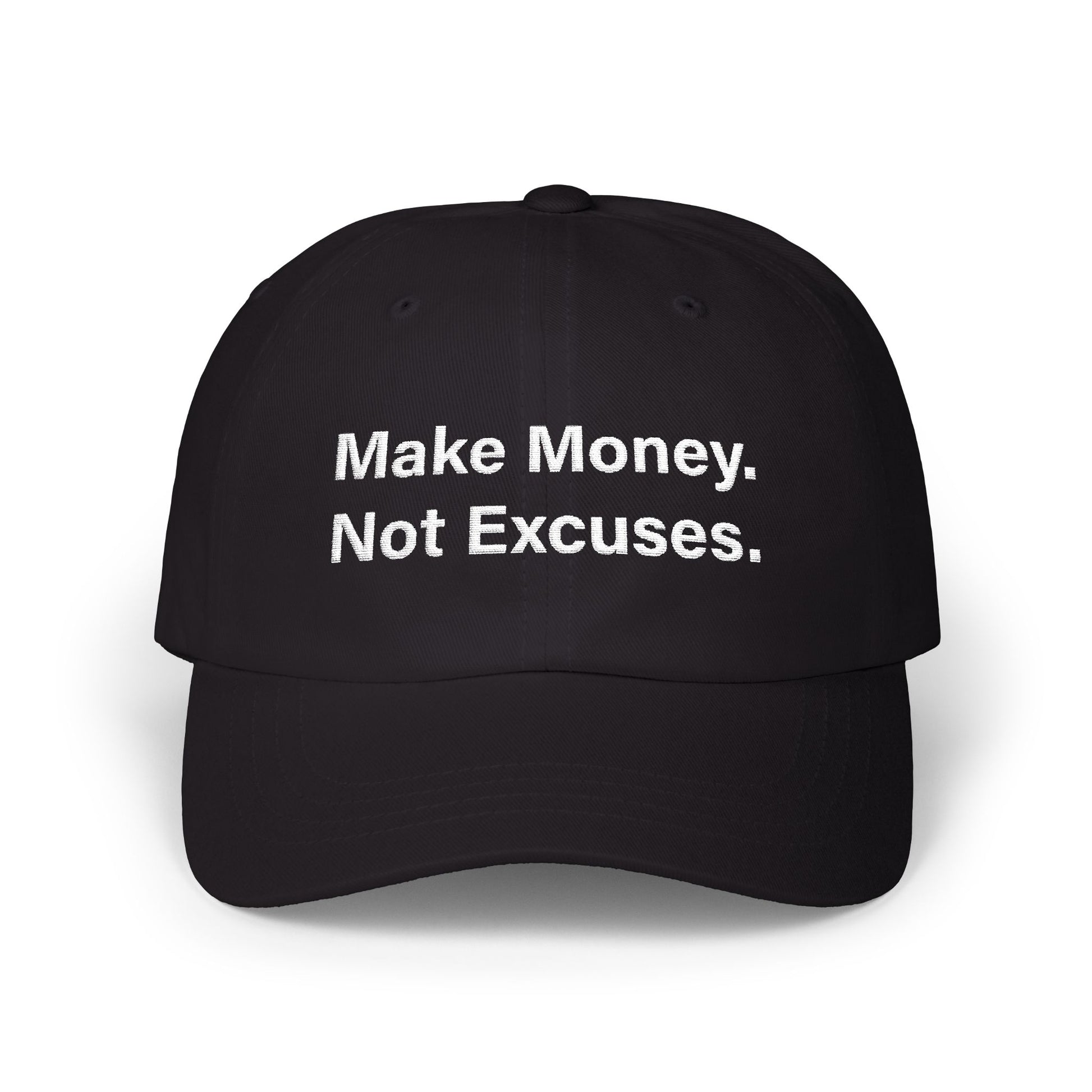 Stay stylish and motivated with this 'Make Money Not Excuses' Cap. The perfect accessory for those who prioritize productivity and positivity in their daily lives. Ideal for adults looking to make a statement with their attire, especially great for entrepreneurs, hustlers, and go-getters. Perfect for gifting during birthdays, holidays, or as a motivational gesture.
