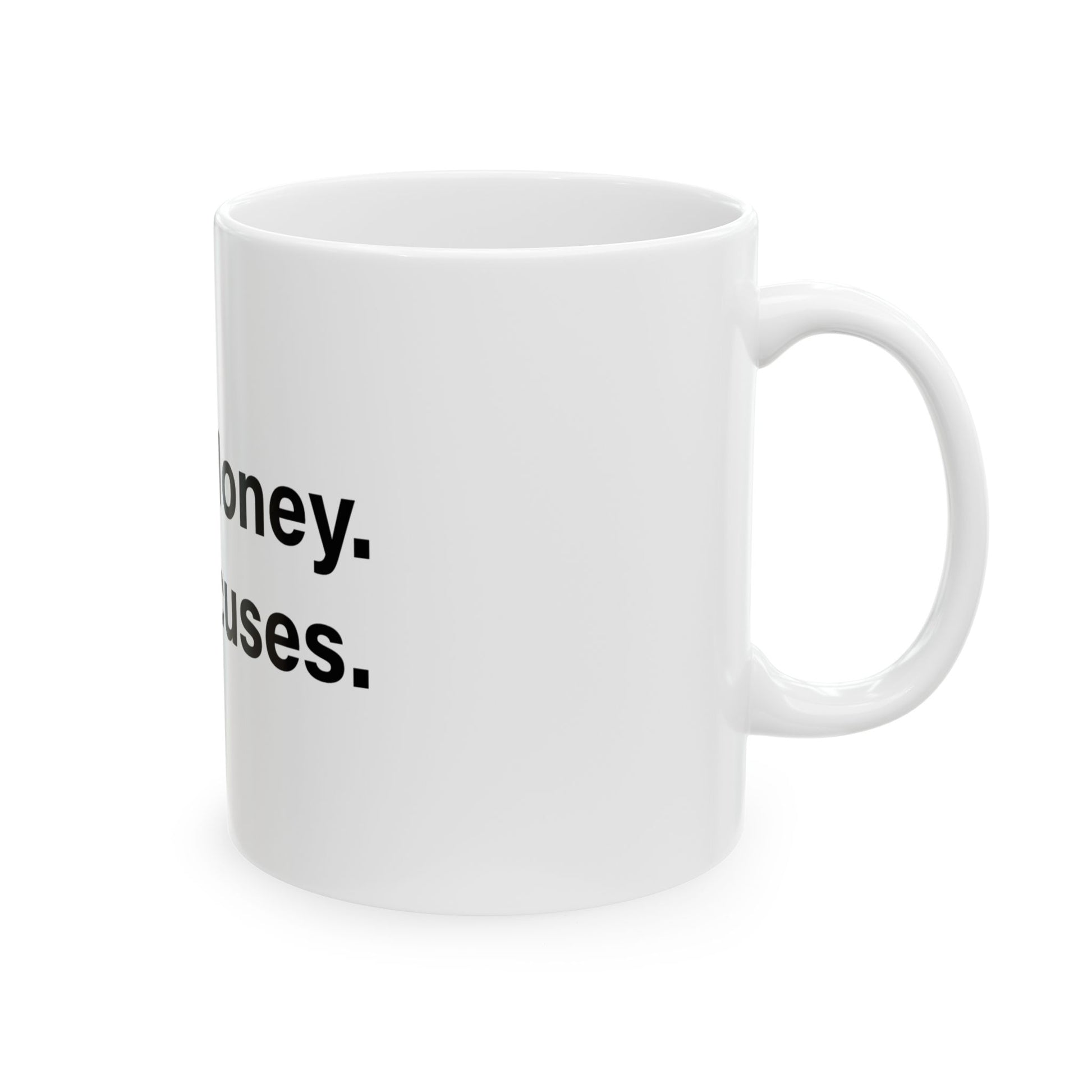 This 'Make Money. Not Excuses.' 11oz mug is perfect for anyone looking for daily motivation and inspiration. The vibrant colors and glossy finish make it a great addition to your morning routine, reminding you to focus on making money and avoiding excuses. Ideal for entrepreneurs, hustlers, and dreamers. Perfect gift for birthdays, Christmas, graduation, or just because.